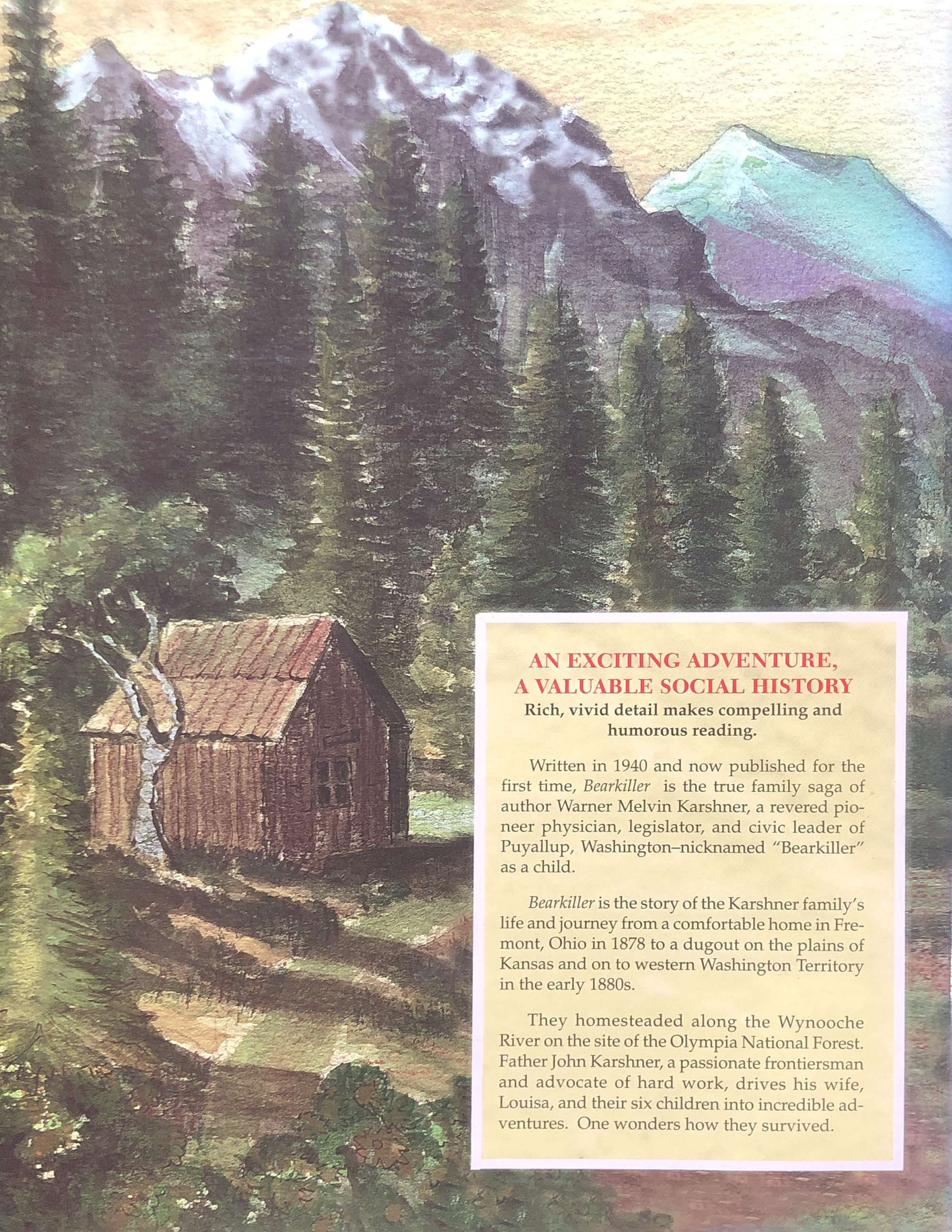 An exciting adventure, a valuable social history - Rich, vivid detail makes compelling and humorous reading. Written in 1940 and now published for the first time, Bearkiller is the true family saga of author Warner Melvin Karshner, a revered pioneer physician, legislator, and civic leader of Puyallup, Washington - nicknamed "Bearkiller" as a child. Bearkiller is the story of the Karshner family's life and journey from a comfortable home in Fremont, Ohio in 1878 to a dugout on the plains of Kansas and on to western Washington Territory in the early 1880s. They homesteaded along the Wynooche River on the site of the Olympia National Forest. Father John Karshner, a passionate frontiersman and advocate of hard work, drives his wife, Lousia, and their six children into incredible adventures. One wonders how they survived.